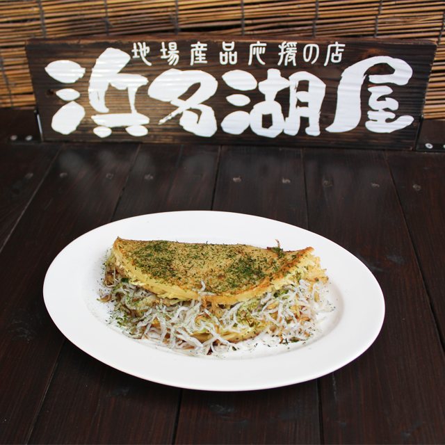 潮見坂名物!浜名湖焼き!遠州灘産のしらすをたっぷり入れて焼き上げたお好み焼きか?と